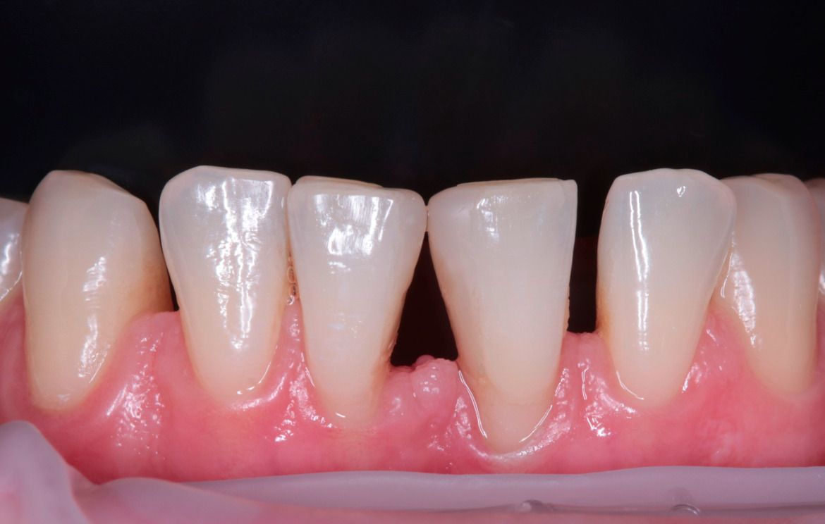 Пациенту была проведена пластика десны в области фронтальной группы зубов с последующей терапевтической реставрацией.