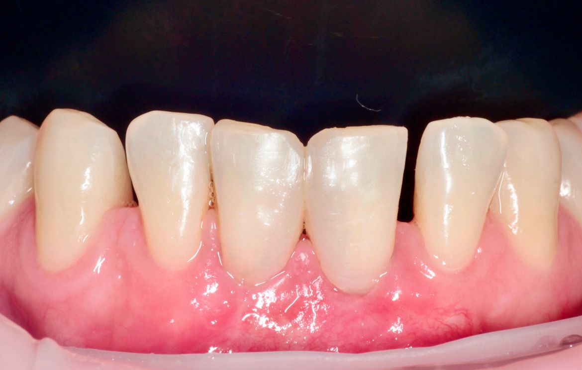 Пациентка Я, обратилась с жалобой на оголение корней и черный промежуток между центральными нижними зубами.
